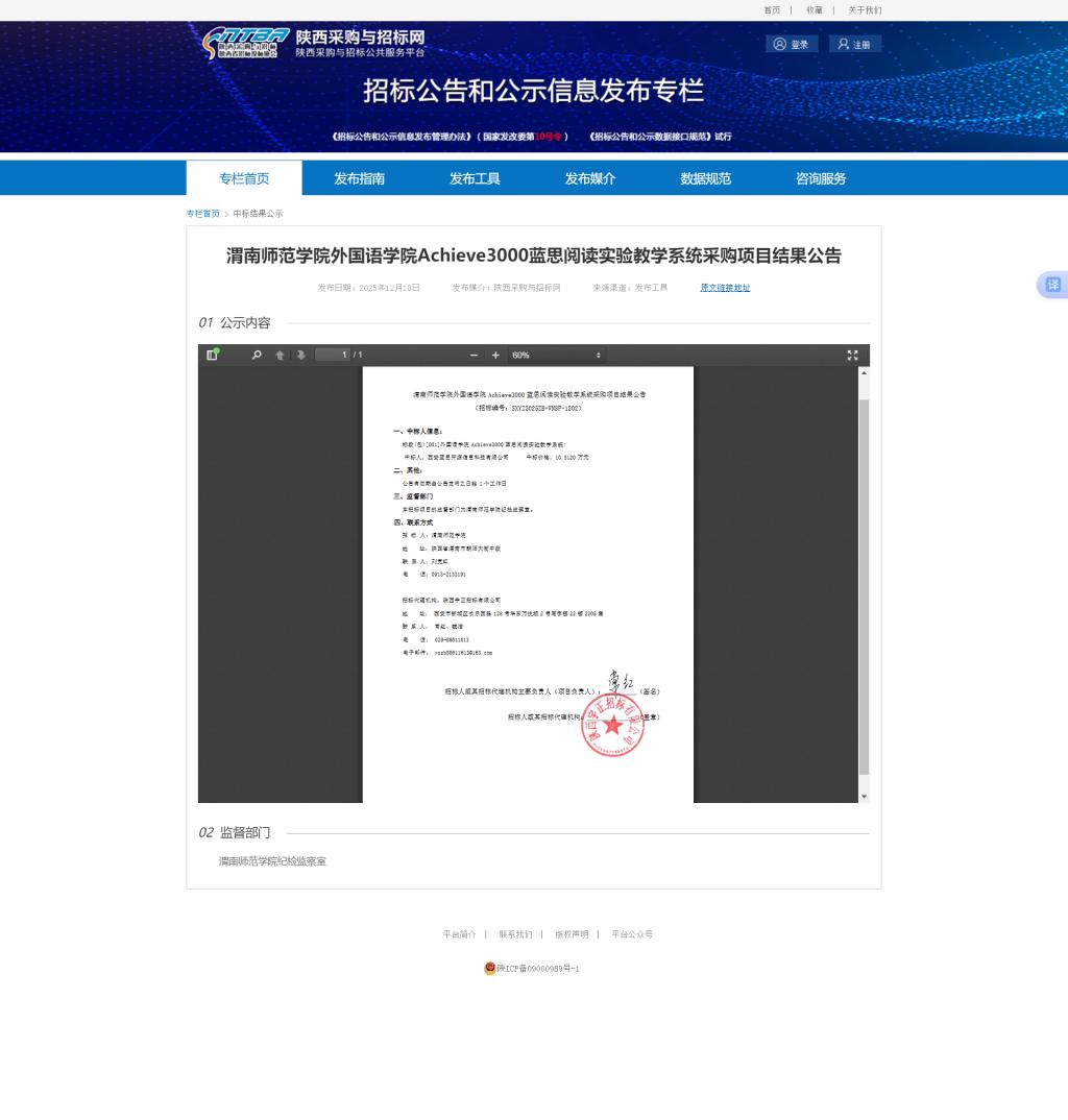 渭南师范学院外国语学院Achieve3000蓝思阅读实验教学系统采购项目结果公告