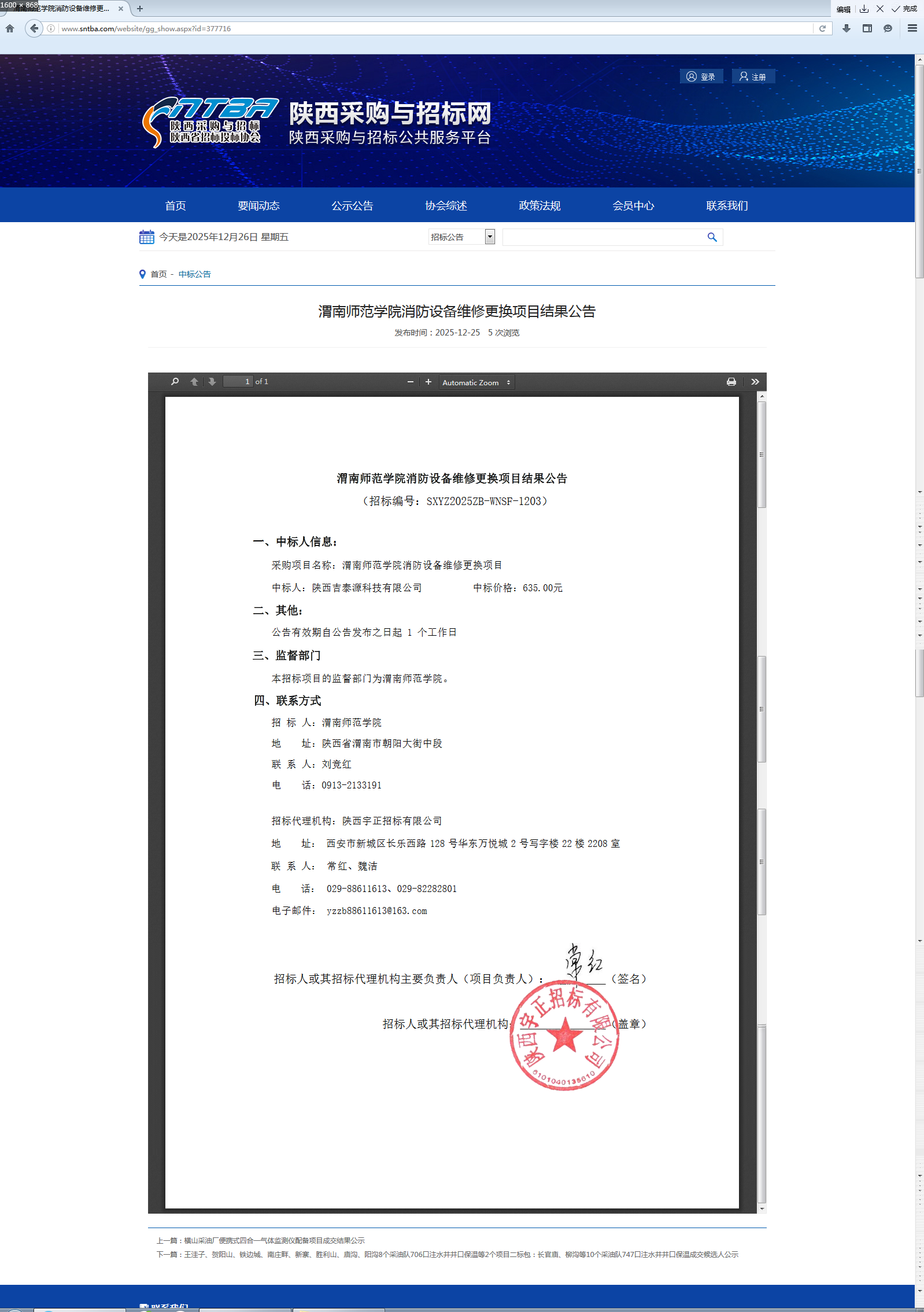 渭南师范学院消防设备维修更换项目结果公告