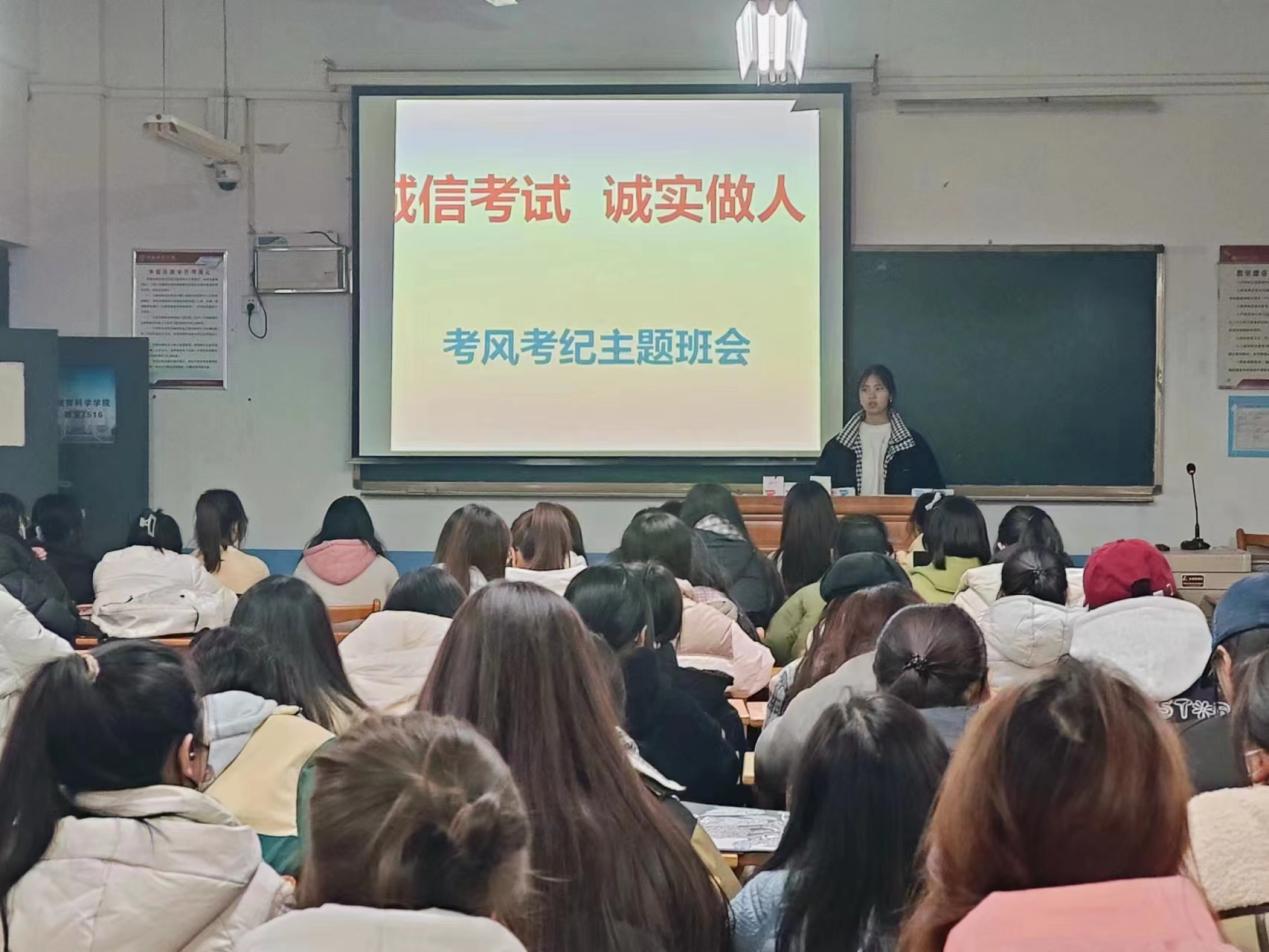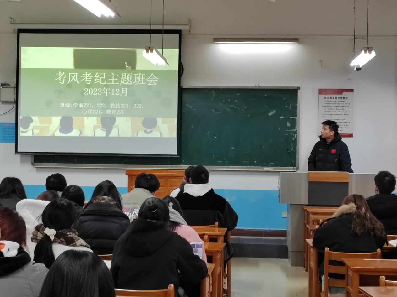 为了进一步加强学风建设,严肃考风考纪,端正学生的学习态度和行为规范,树立正确的诚信考试观念,营造良好的考试氛围,教育科学学院于2023年12月上旬组织各班开展了考风考纪教育主题班会。