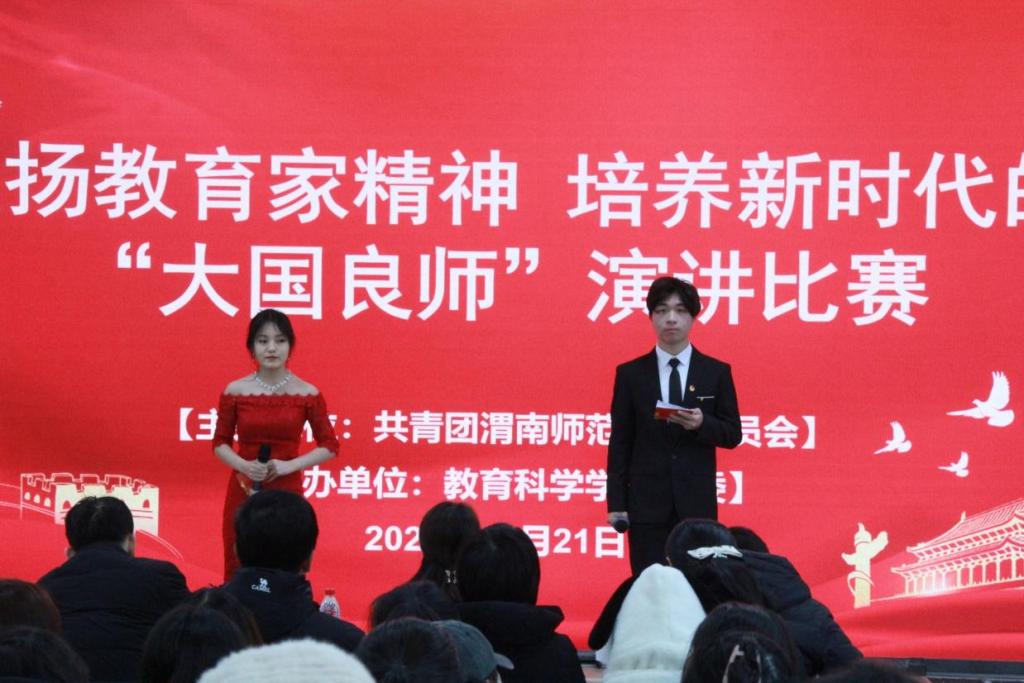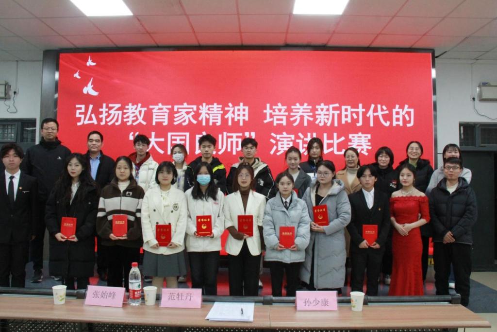 12月21日下午,由校团委主办,教育科学学院团委承办的“弘扬教育家精神,培养新时代的大国良师”演讲比赛在博识楼1101教室举行。教育科学学院教授范牡丹、人文学院副教授张始峰、教育科学学院青年教师孙少康担任比赛评委。