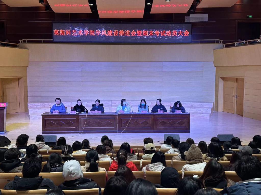 12月21日,莫斯科艺术学院召开学风建设推进暨期末考试动员大会。党总支副书记叶晓燕、副院长高红菊、学工办副主任段菲、教务秘书王瑜、全体辅导员及2023级、2022级全体学生2021级、2020级学生干部共计500余人参加,会议由叶晓燕主持。