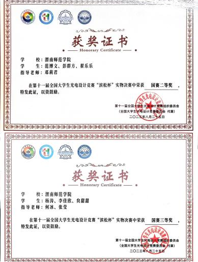 围绕提高学生学习兴趣、增长学生见识、锻炼学生能力,鼓励学生参与各项竞赛活动。2023年,学生在师范生技能比赛、大学生物理教学技能竞赛、全国大学生物理实验大赛、蓝桥杯全国大学生信息与技术应用竞赛、全国光电设计大赛、全国大学生电子设计竞赛、全国大学生机械创新创意竞赛、中国大学生工程实践与创新能力大赛、中国国际‘互联网+’大学生创新创业大赛,等各类学科竞赛获得国家级奖项40人次,省部级获奖134人次。