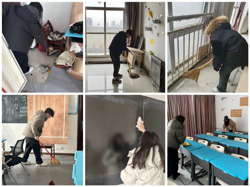 学院师生针对教室、画室等区域的地面颜料残痕、黑板窗台、桌斗卫生、桌椅摆放等细节再作了一次全面细致的清洁整理。在室外对绿化带、道路旁堆积的落叶、杂草等卫生死角进行彻底清扫,各班划分区域,实行班级包干制,确保了实践活动有序有效进行。