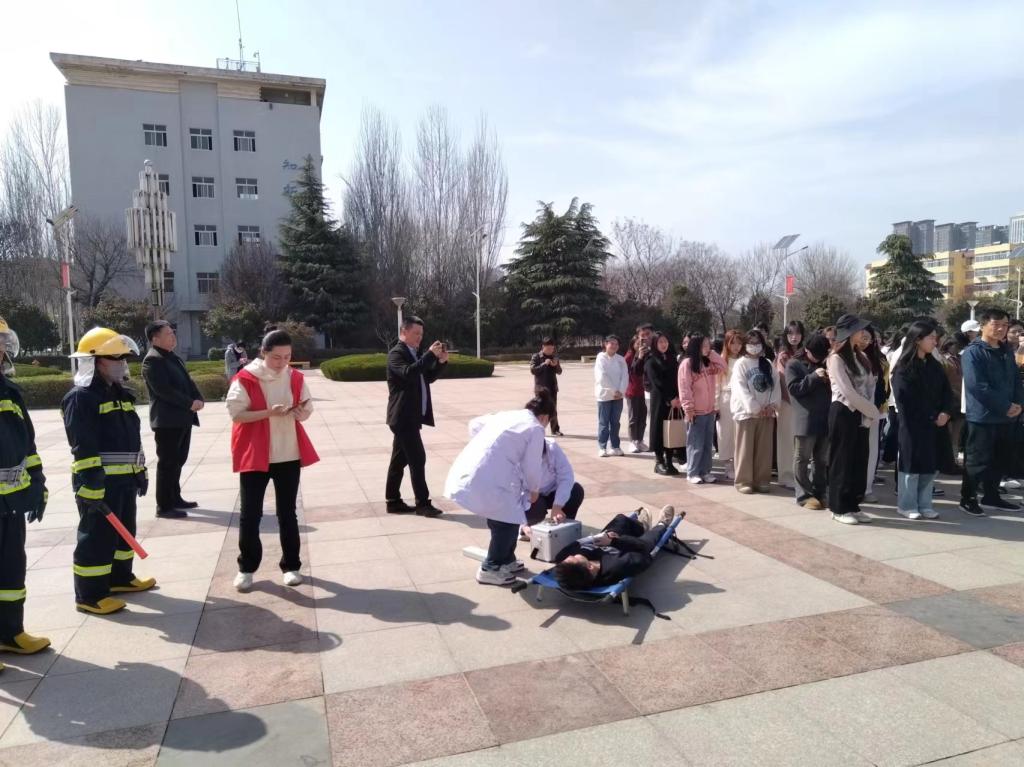演练现场,保卫处副处长苟卫锋宣读了演练活动方案,详细讲述了身处火场时的注意事项、逃生技能、疏散安全、疏散路线和疏散集合点要求等方面内容。保卫处处长马利涛宣布“演练活动正式开始”开始后,随着模拟火灾的警报响起,上课教师告知学生“不要慌”,指挥学生按照规定路线迅速有序撤离,到达疏散地点清点人数,全员疏散仅用时3分58秒。疏散过程中,消防员和医生护士展开现场搜救工作,及时将“受伤学生”撤离到安全区域,并立即开展创伤包扎、心脏复苏等抢救工作。
