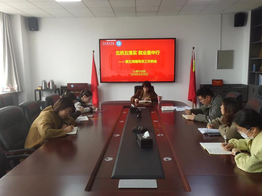 3月26日上午,计算机学院于同心楼5406会议室召开“五抓五落实就业重中行”第五周辅导员工作例会,学院党总支副书记、副院长张俊娜主持会议,学工办主任李雷玮及全体专职辅导员参会。