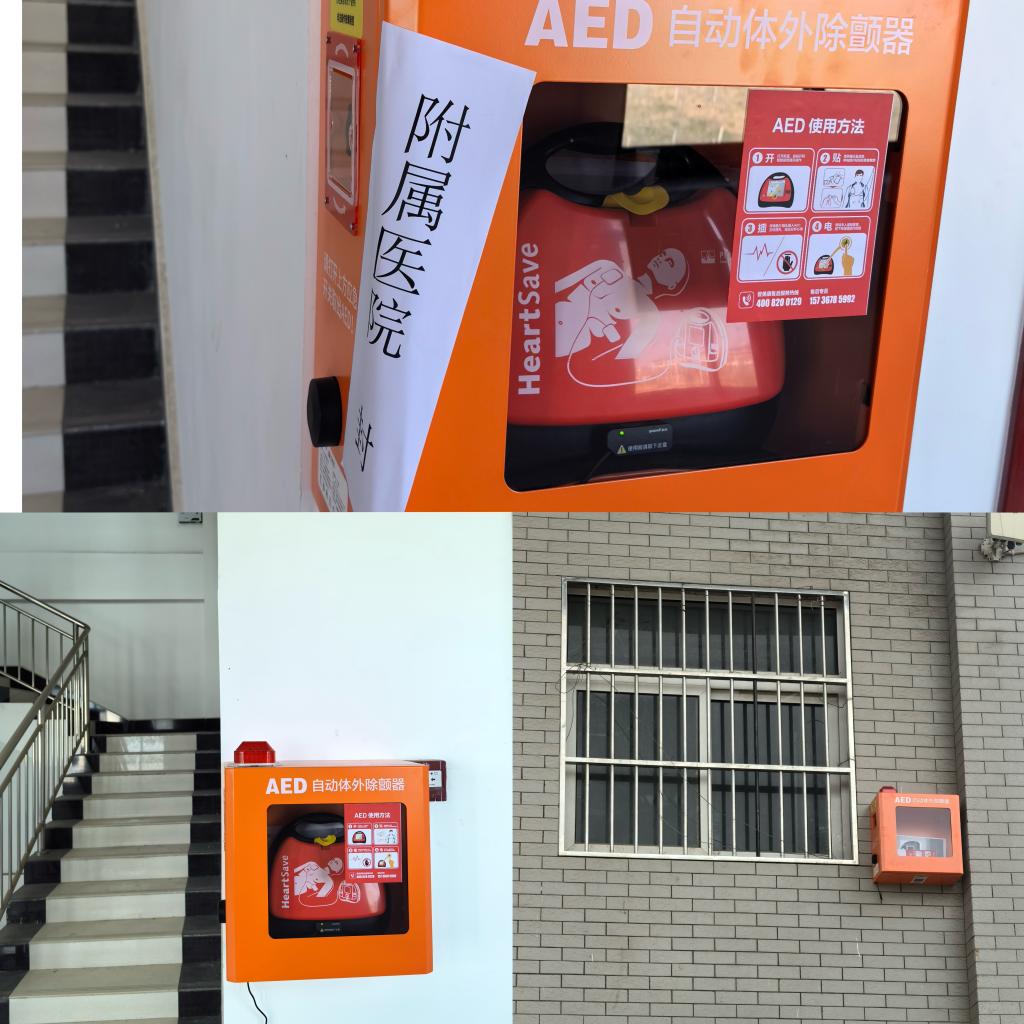自动体外除颤器(AED),是一种智能、便携的可供非专业人员使用的急救医疗设备,用于抢救因心室颤动和无脉性室性心动过速导致的心脏骤停,它对人体的特定区域放电,使心脏恢复正常的心跳节律。遇到心跳骤停患者,只有在最佳抢救时间的“黄金四分钟”内,利用AED对患者进行除颤和做心肺复苏,才是有效制止猝死的办法,它们被称为院前挽救心源性猝死的急救“黄金搭档”。自动体外除颤仪(AED)的安装完成,是我校积极响应上级号召,创建公众卫生应急技能提升行动示范单元的重要举措之一,进一步筑牢了我校师生的生命安全屏障。