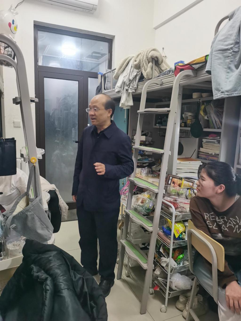 4月13日晚,为了进一步了解学生的学习生活状况,落实学生工作例会要求,经济与管理学院党总支书记李富荣深入富平校区学生宿舍进行检查指导,辅导员王晶、杨雯婕及学生干部同行。