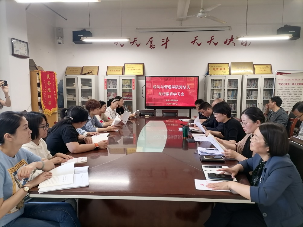 学习会上,经济与管理学院党总支副书记、院长袁梁和党总支副书记谢稷光领学了习近平总书记关于党纪学习教育的重要指示精神、中央党的建设工作领导小组召开会议研究部署党纪学习教育工作、省委召开常委会会议暨党的建设工作领导小组会议认真学习习近平总书记重要讲话重要指示精神研究部署全省党纪学习教育工作、关于在全校开展党纪学习教育的实施方案等资料,随后,教师党员认真学习了中共中央关于印发《中国共产党纪律处分条例》的通知、《中国共产党纪律处分条例》第一章的内容。