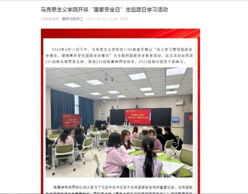 家是最小国,国是千万家。国家安全需要人人参与、人人维护。下一步,马克思主义学院将持续加大国家安全知识宣传教育力度,丰富宣传形式,切实推动国家安全宣传教育工作落地增效,为构建平安渭南营造良好的环境。(通讯员 蔺怡轩 审核人 赵国峰)