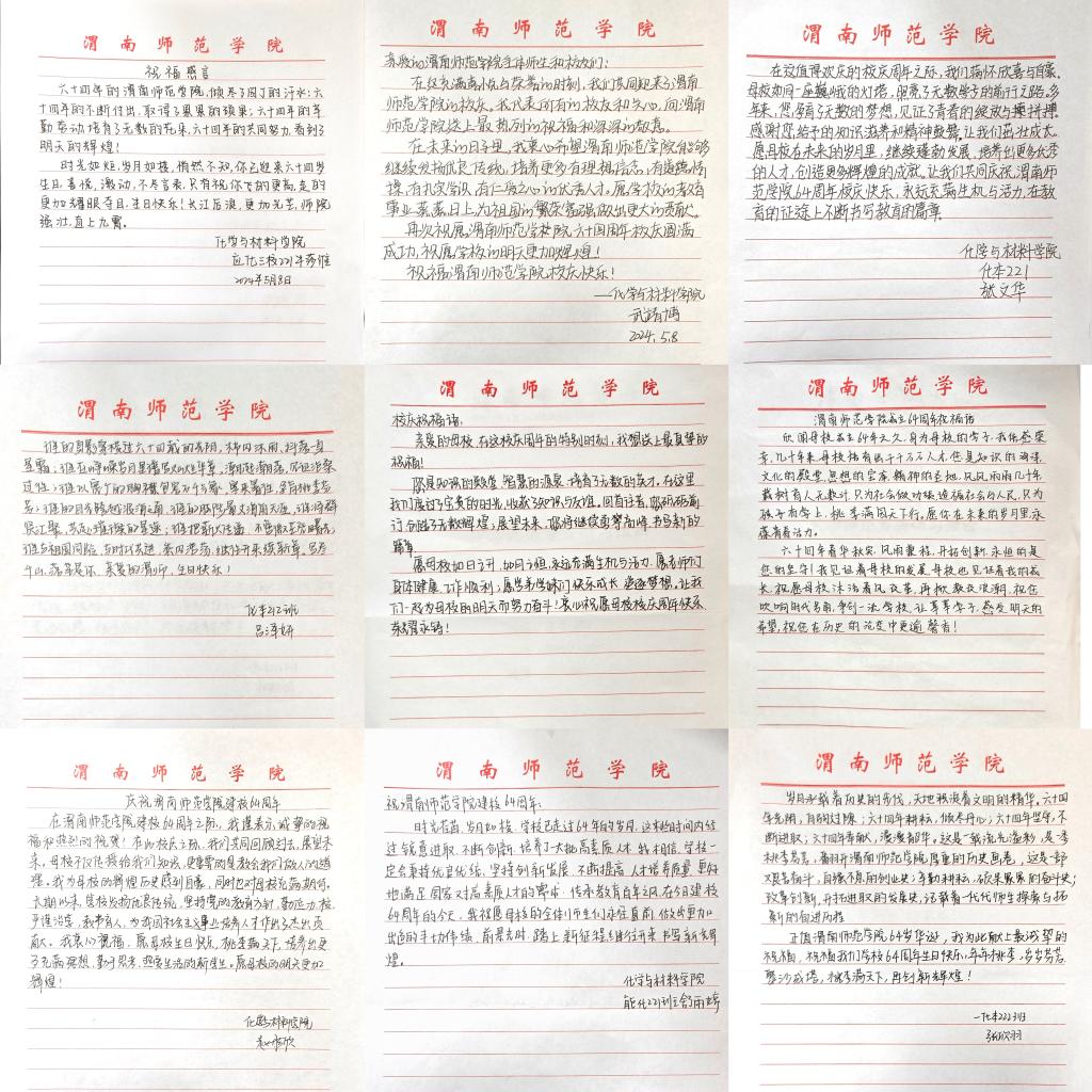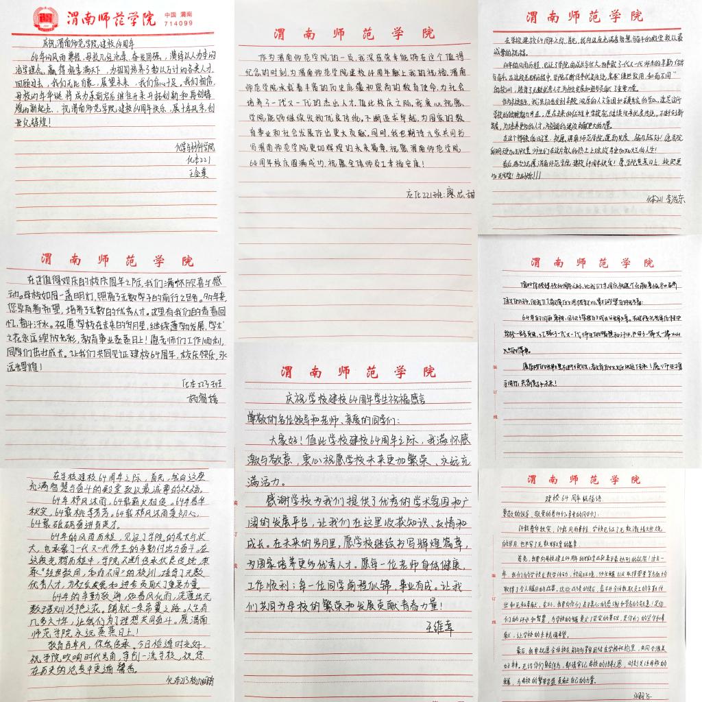 主题活动包含“手写祝福语”、“我为校庆献礼”、“校庆打卡地”三个活动。其中,“手写祝福语”活动学院共收到了自100余名学生为学校送上的祝福,淳朴的纸张,秀美笔墨字迹,质朴的语言,透露出学生对母校的深深祝福之情和作为“渭师人”的自豪之感。同时,也展现了作为当代“渭师人”的使命与担当;传递出学生感恩母校,回报母校的心声;共同为母校的辉煌明天贡献自己青春力量的决心和信心。