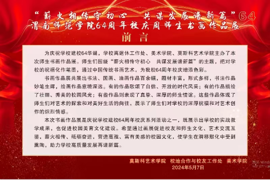 5月8日至16日,学校离退休工作处、美术学院、莫斯科艺术学院主办了本次师生书画作品展。师生们围绕“薪火相传守初心 共谋发展谱新篇”的主题,把对学校的祝福化作笔墨,通过中国传统书画艺术,为我校64周年校庆增添色彩。