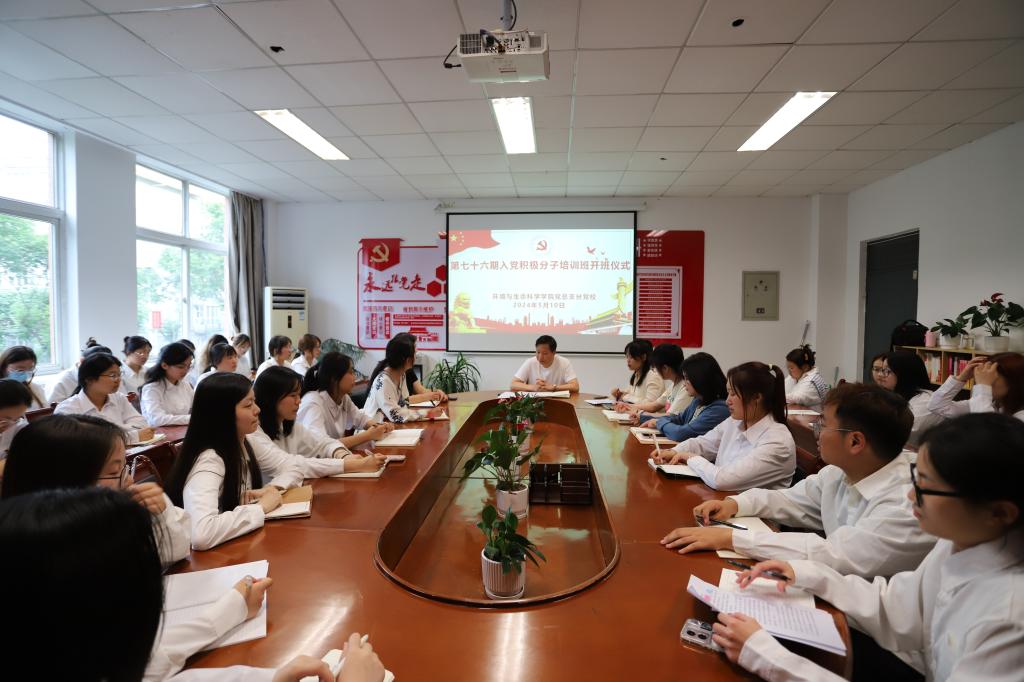 5月10日, 环境与生命科学学院党总支分党校在C212“初心固本”党员活动室举行第七十六期入党积极分子培训班开班仪式。学院党总支副书记、副院长刘龙飞,师生融合党支部委员会全体委员以及40余名入党积极分子参加了开班仪式,会议由党总支秘书、师生融合党支部书记冯雨主持。