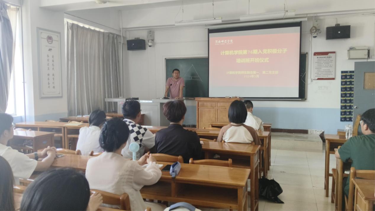 5月22日中午,计算机学院于同心楼5412教室召开第七十六期入党积极分子党课培训开班仪式。师生融合第一党支部书记李雷玮、第二党支部书记薛飞及36名第七十六期积极分子参加开班仪式。仪式由李雷玮主持。