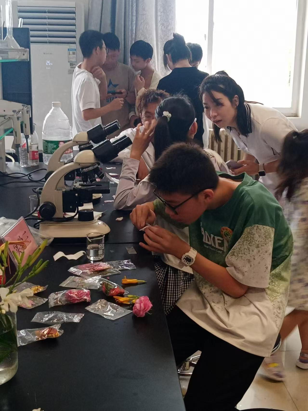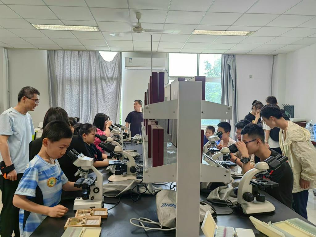 主讲教师李亚琳教授、史秀超博士为前来参观的小学高年级以及初中学生讲解细胞的结构与功能,现场指导学生观察组织切片以及植物花粉、叶片的结构,让学生沉浸式体验临时装片制作过程,并观察自己的口腔上皮细胞结构。此外,指导教师还带领学生参观了人体结构模型及动植物标本。