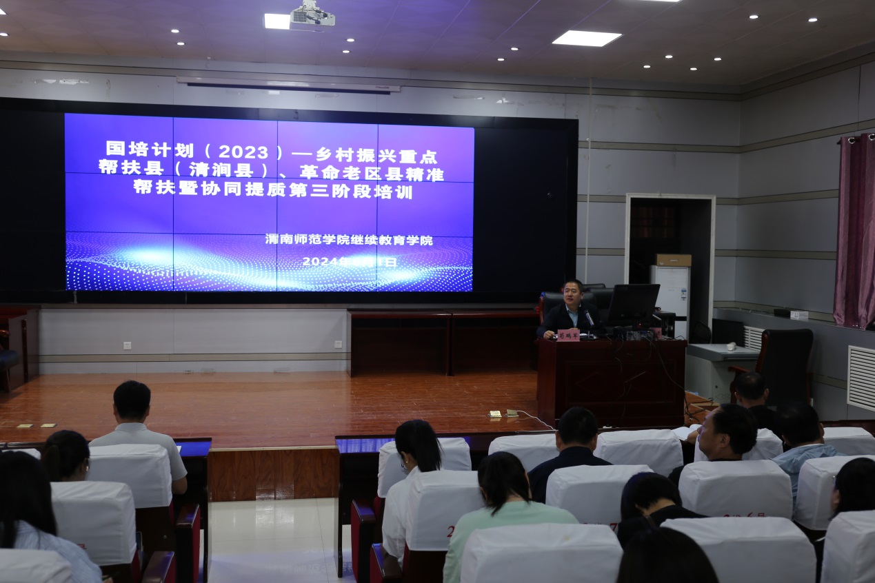 6月1日,我校组织高水平专家团队,赴清涧县开展国培计划(2023)—乡村振兴重点帮扶县、革命老区县(清涧)精准帮扶暨协同提质培训第三阶段研修活动。继续教育学院副院长苟鹏军、清涧县教体局教育教学分管领导白锋锋、清涧县教体局基教三股股长李伟,县培训者团队研修班学员40人以及“名师+”“名班主任+”研修共同体主持人、核心成员20人、义务段学校体育教师参加了本次研修活动。