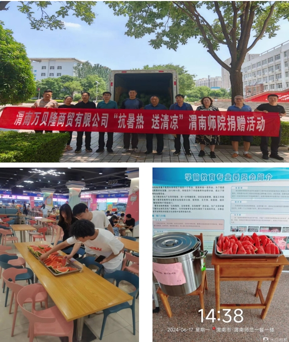 6月17日上午,渭南万贝隆商贸有限公司积极参与“夏日送清凉”活动,捐赠6000余斤西瓜,部分西瓜直接发放至直附属单位、各二级学院,部分西瓜放置在食堂各楼层及防暑降温供应点,免费供给用餐师生。