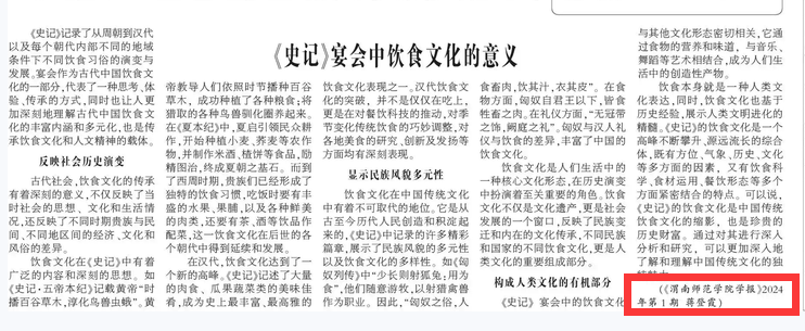 《渭南师范学院学报》2024年第1期刊发的学术论文《论〈史记〉宴会中的饮食文化》被《文摘报》2024年6月5日(总第4768期)第6版的“光明学林”转摘,转摘题目为《〈史记〉宴会中的饮食文化的意义》。