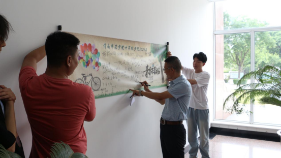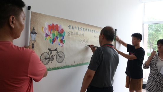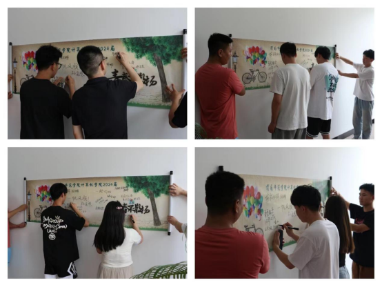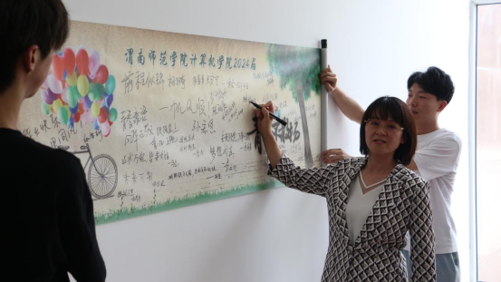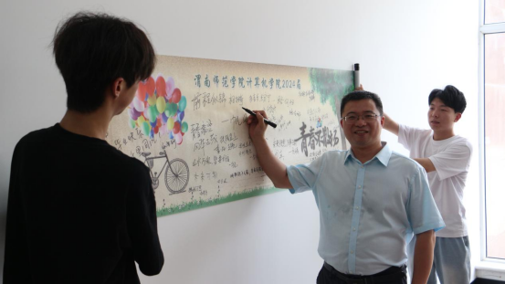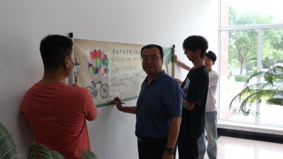 座谈会后,师生们移步同心楼一楼大厅,开展离别签字送祝福活动。毕业生们纷纷在美丽的卷轴上留下自己对未来生活的期许和对母校的眷恋。这些赠言不仅是对自己未来的勉励,更是对学院的一份深情告别。每一句赠言都蕴含着毕业生们对大学生活与青春岁月的珍视和对未来的无限憧憬。学校教务处处长孙宏恩、学院领导老师们也纷纷加入祝福留言队伍,在留言板上写下了对毕业生的真情祝福和美好期待,寓意着毕业生们即将从这里扬帆起航,踏上人生新的征程。(通讯员 李雷玮 审核人 张俊娜)