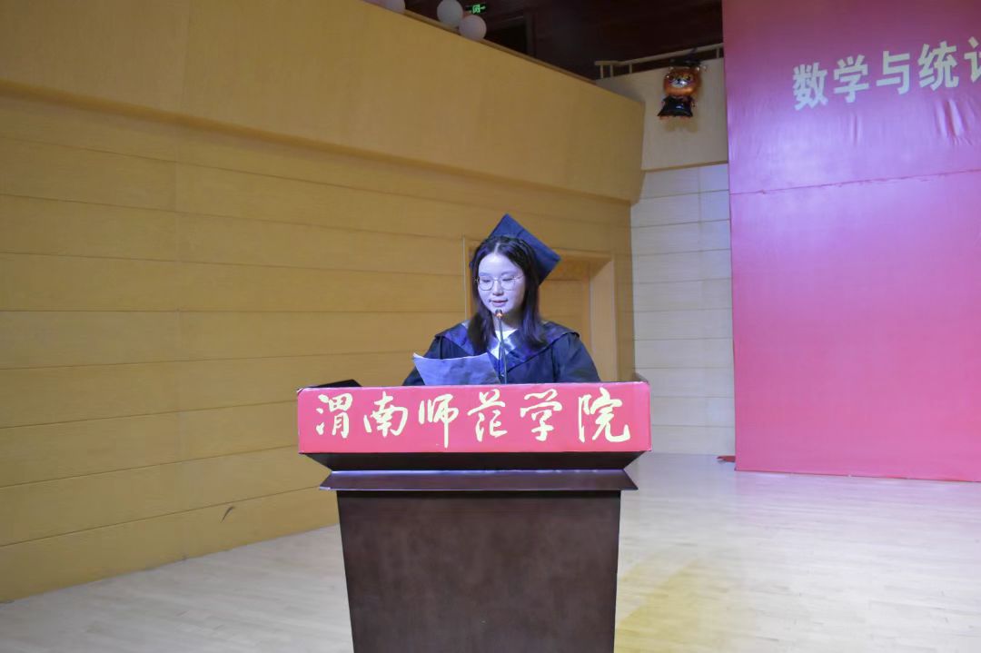 优秀毕业生、考研学生代表数本204班毛盈盈发言。她回顾和分享了大学四年的努力和收获,对老师和学院的悉心栽培表达衷心的感谢和诚挚的敬意,并祝愿学院蓬勃发展,再书华章。