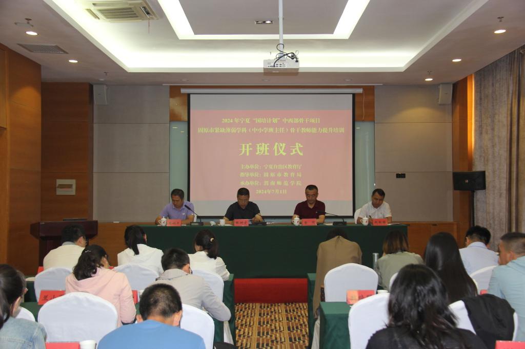 7月1日上午,由宁夏教育厅主办,渭南师范学院承办的2024年“国培计划”宁夏中西部骨干项目——中小学班主任能力提升培训在宁夏固原开班。继续教育学院副院长苟鹏军、项目首席专家赵教练、固原市教育体育局副局长张树宏、固原市师资培训中心主任童岗出席了开班仪式。来自固原市的50名中小学班主任将参加为期7天的集中学习和教学实践。