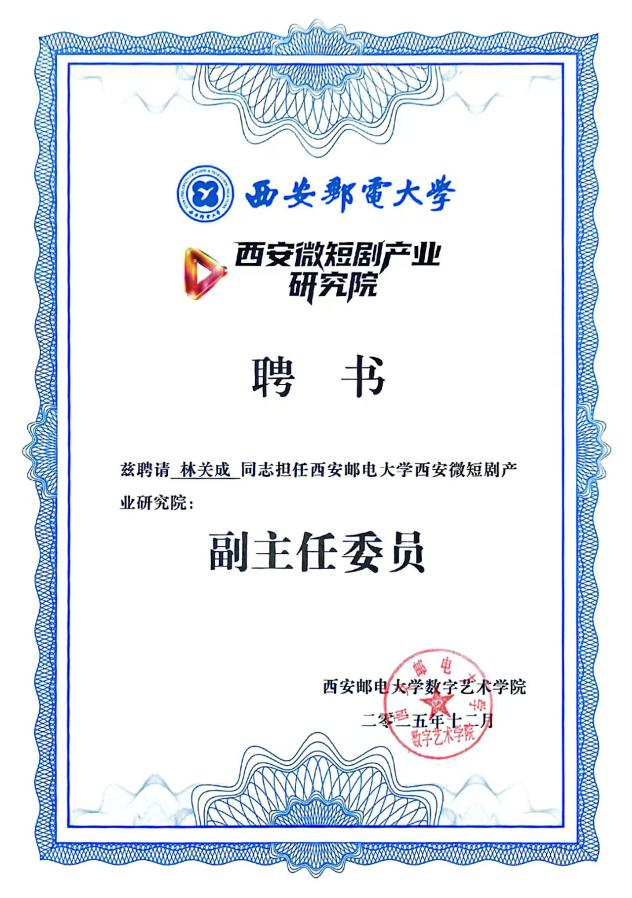 研究院专家委员会聘任环节,陕西电影家协会副主席、著名导演张磊(张忠华)作为专家委员会主任委员,为林关成院长颁发了副主任委员聘书。此次受聘的专家委员会成员涵盖西安交通大学、陕西师范大学、西北政法大学等多所高校的二级学院负责人,汇聚了学术与产业前沿的顶尖智慧,将为微短剧产业的人才培养、学术研究、技术研发等提供专业指导。林关成表示,将积极履行副主任委员职责,依托渭南师范学院传媒学院的教学科研优势,为推动微短剧产业的创新发展与生态建设贡献高校力量。