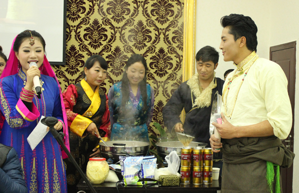 能歌善舞的藏族同学表演了独具特色的藏族歌曲和舞蹈,优美的旋律、动人的舞姿赢得了热烈的掌声。藏族同学给领导及嘉宾献上了洁白的哈达和亲手制作的甜茶,一声“扎西德勒”祝福所有来宾。藏族同学即兴表演了民族舞蹈、清唱民族歌曲,将联欢会气氛推向高潮,现场其他少数民族同学代表也送上了他们的节日祝福。