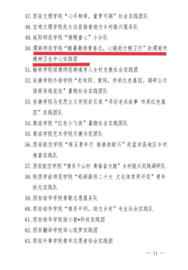 近日,由陕西省委宣传部、省委文明办、省委教育工委、团省委、省学联等单位联合组织开展的“2022年陕西省大中专学生志愿者暑期文化科技卫生‘三下乡’社会实践活动”评选表彰结果揭晓,我校荣获“2022年‘三下乡’活动省级优秀组织单位”;我校“酷暑激扬青春志,心援助力精卫行”赴渭南市精神卫生中心实践团被评为“省级优秀团队”;指导教师刘原被评为“省级先进个人”。