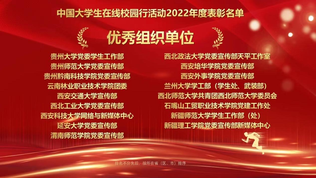近日,教育部中国大学生在线2022年度校园号建设研讨暨校网通工作年会在北京召开。会上揭晓了2022年度表彰名单。我校获得“年度校园新媒体互动百强”、“校园行活动优秀组织单位”荣誉称号,这是我校首次获得该荣誉。