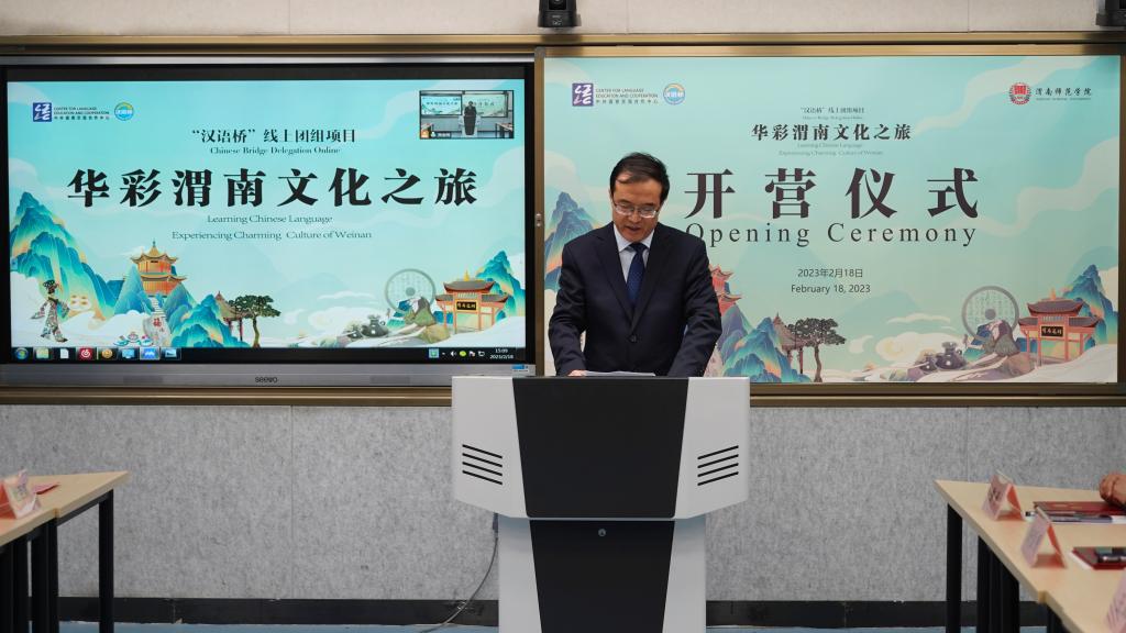 2月18日北京时间15:00,我校举行“汉语桥”线上团组项目——华彩渭南文化之旅体验营开营仪式。副校长曹强出席仪式并讲话。开营仪式由国际教育学院院长杜百顺主持。