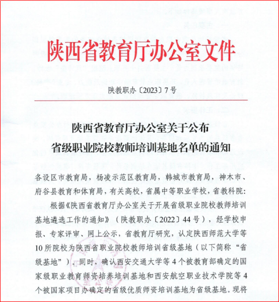 近日,陕西省教育厅办公室印发《关于公布省级职业院校教师培训基地名单的通知》(陕教职办〔2023〕7号),我校成功获批陕西省职业院校教师培训省级基地(以下简称“省级基地”)。本次共认定18所院校为省级基地,其中10所院校为新增基地。这是继我校获批“陕西省中小学教师培训基地”后,获批的又一个省级培训基地。
