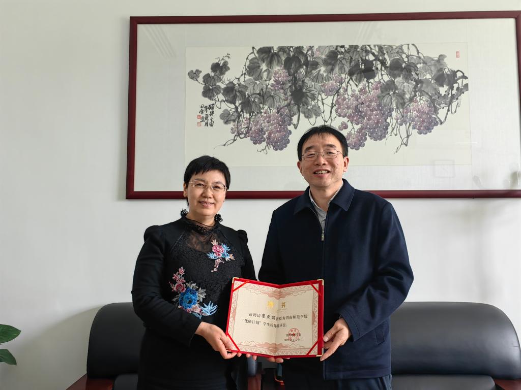 随后,张守华为崔亚丽教授颁发我校“优师计划”学生校外辅导员证书。