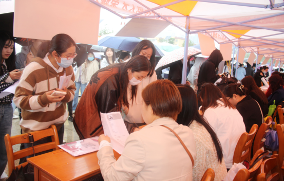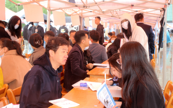 风雨挡不住招聘企业和求职者的热情,上午10时,招聘会现场已经涌入了大量求职者,现场人头攒动。求职者与各企业招聘负责人在现场面对面交流沟通,听取用人单位关于岗位需求、薪资待遇等情况说明,多名求职者现场填写了求职登记表。
