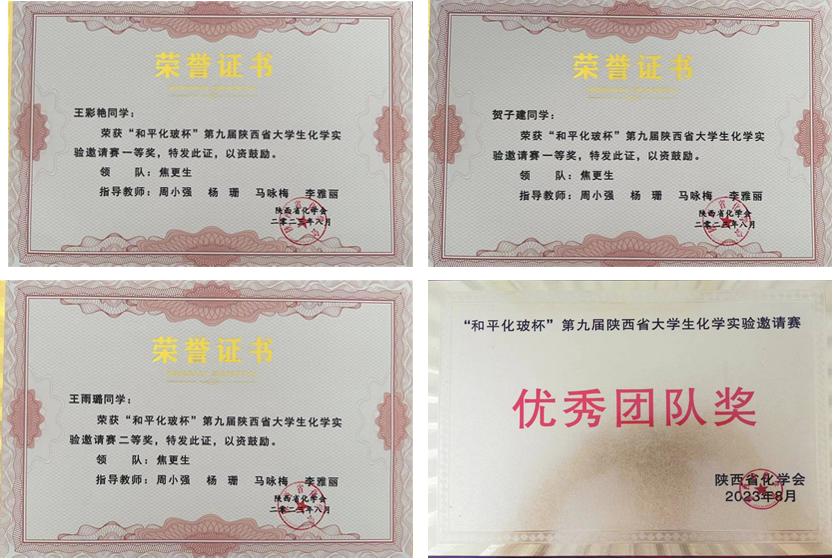 8月20至22日,由陕西省化学会和陕西省化学实验中心联席会主办,延安大学承办的第九届陕西省大学生化学实验邀请赛在延安大学举行。本次大赛,共有来自全省24所高校共75名化学类本科生参赛。我校化学与材料学院杨珊和周小强老师带领2020级化学专业3名学生参赛,王彩艳、贺子建同学分别获得一等奖,王雨璐同学获得二等奖,由于成绩优异,大会同时授予我校“优秀团队奖”。