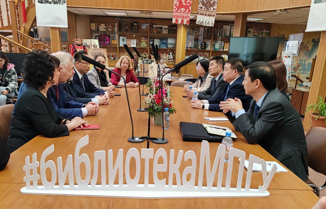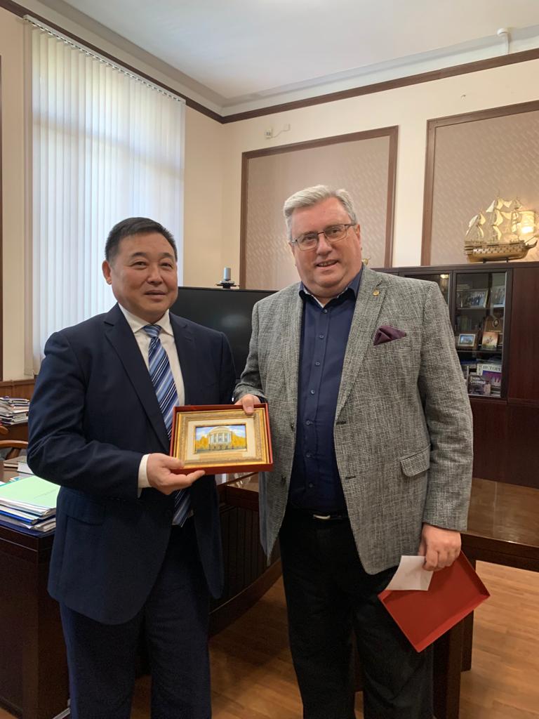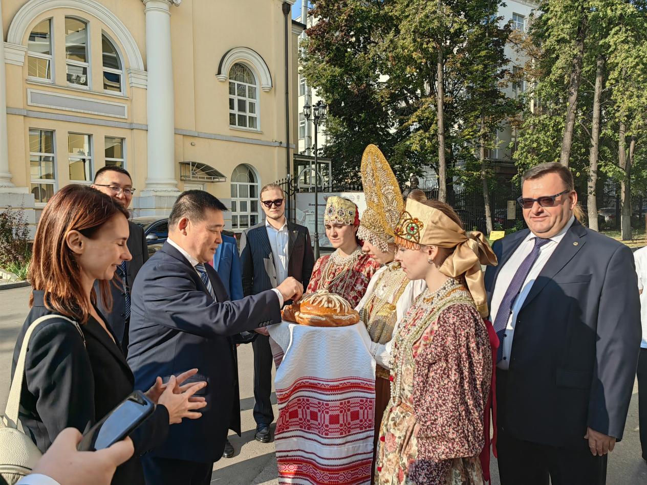 代表团到达莫师大主楼时,该校师生按照当地迎接最尊贵客人“盐和面包”的传统礼节,举行了隆重的欢迎仪式。在与卢布科夫校长的会谈中,他对我校在合作办学中做出的努力表示感谢,对学校近年的快速发展表示了祝贺。卓宇分析总结了两校合作所取得的成绩,就持续加强人才培养和推进深化两校交流合作,提出了具体意见和建议,并表示两校的合作前景远大,有信心通过共同努力,进一步推进两校高质量发展。