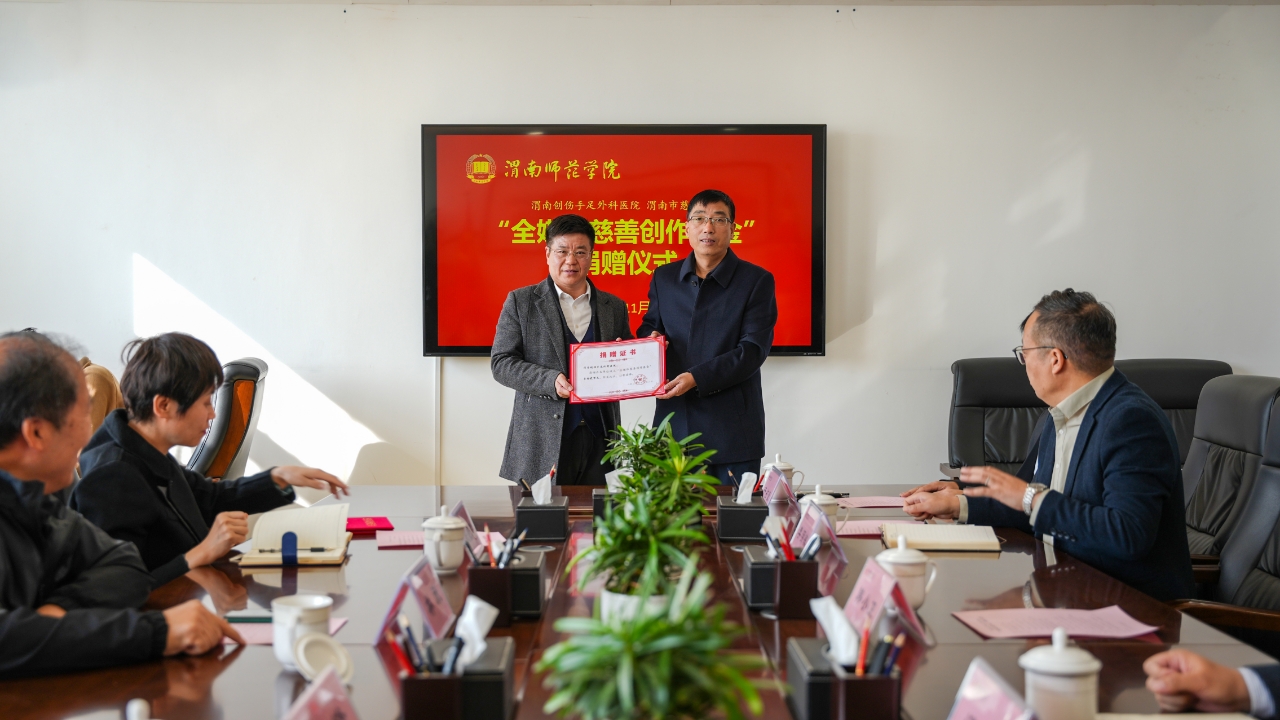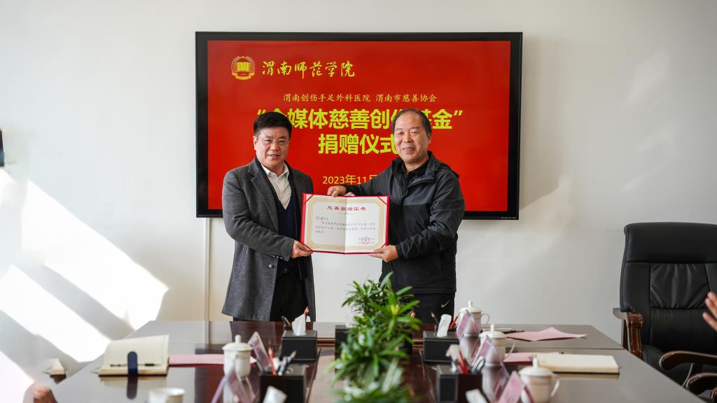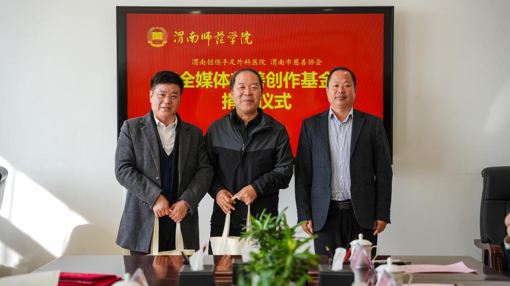 捐赠仪式上,李明敏代表学校接受“全媒体慈善创作基金”;林跃代表渭南市慈善协会向陈锋院长授予慈善捐赠证书;韩小卫、汪勇向陈锋授予“慈善捐赠证书”并赠送学校文创纪念品。