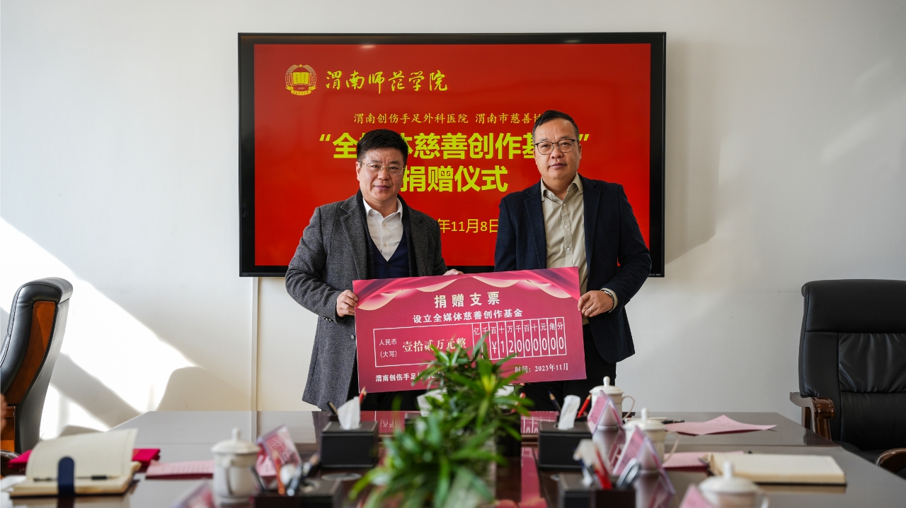 11月8日正值第24个中国记者节,由渭南创伤手足外科医院发起,渭南市慈善协会管理,主要面向我校全媒体中心师生记者的“全媒体慈善创作基金”捐赠仪式在厚德楼第一会议室举行。渭南创伤手足外科医院院长陈锋、渭南市慈善协会副会长林跃、渭南日报社新闻研究室主任张晓玲,我校党委副书记韩小卫、汪勇,党委委员、宣传部部长李明敏,宣传部副部长朱芳转以及20余名师生记者代表参加了仪式。