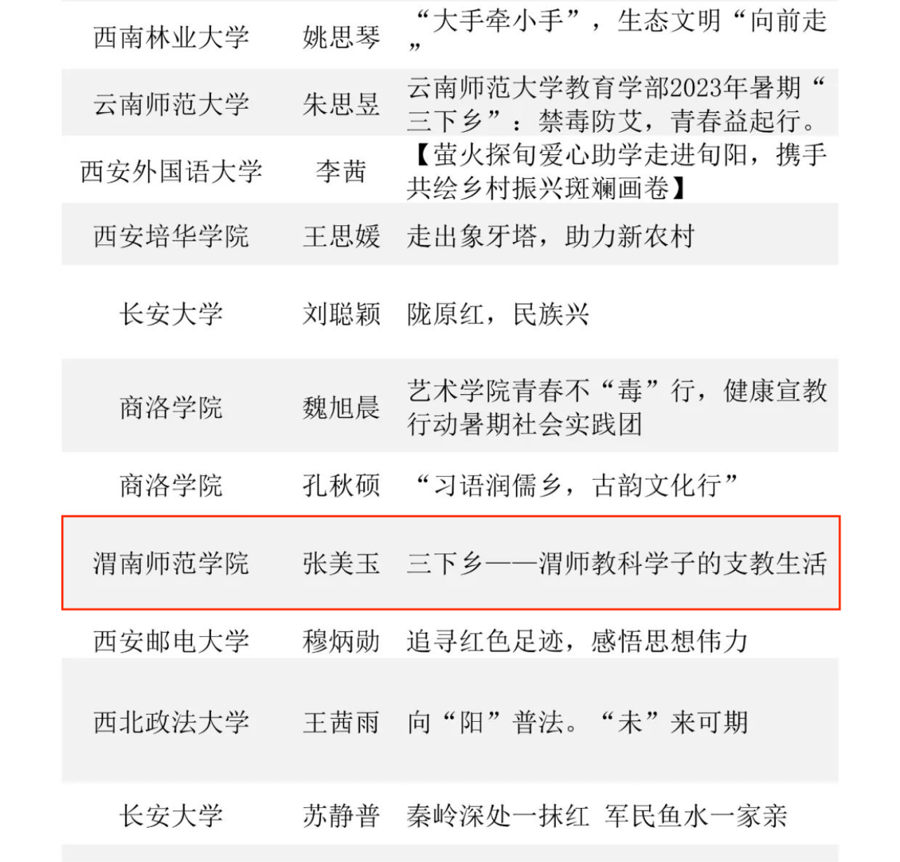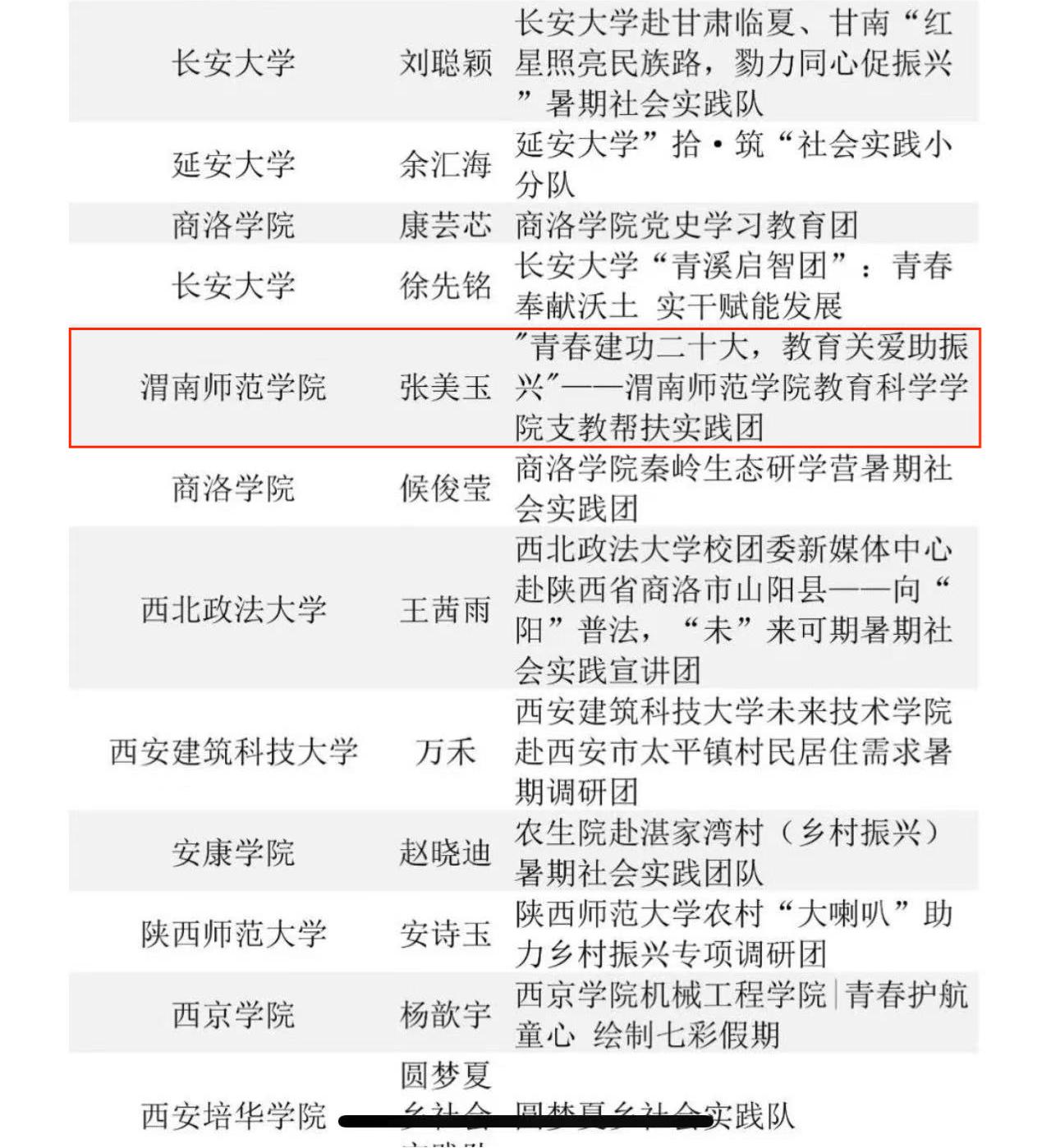 近日,在中国青年报社主办2023大学生社会实践成果“千校千项”网络展示活动中,我校社会实践校级团队“青春建功二十大,教育关爱助振兴”——渭南师范学院教育科学学院支教帮扶实践团荣获2023大学生社会实践成果“千校千项”网络展示活动优秀项目奖,该实践团视频制作者张美玉《三下乡一一渭师教科学子的支教生活》荣获优秀视频奖。