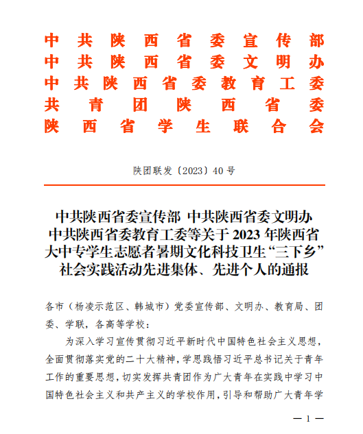 11月15日,陕西省委宣传部、省委文明办、省委教育工委、团省委、省学联联合发文,对2023年陕西省暑期“三下乡”社会实践活动进行总结表彰,我校荣获省级优秀组织单位等多项荣誉。