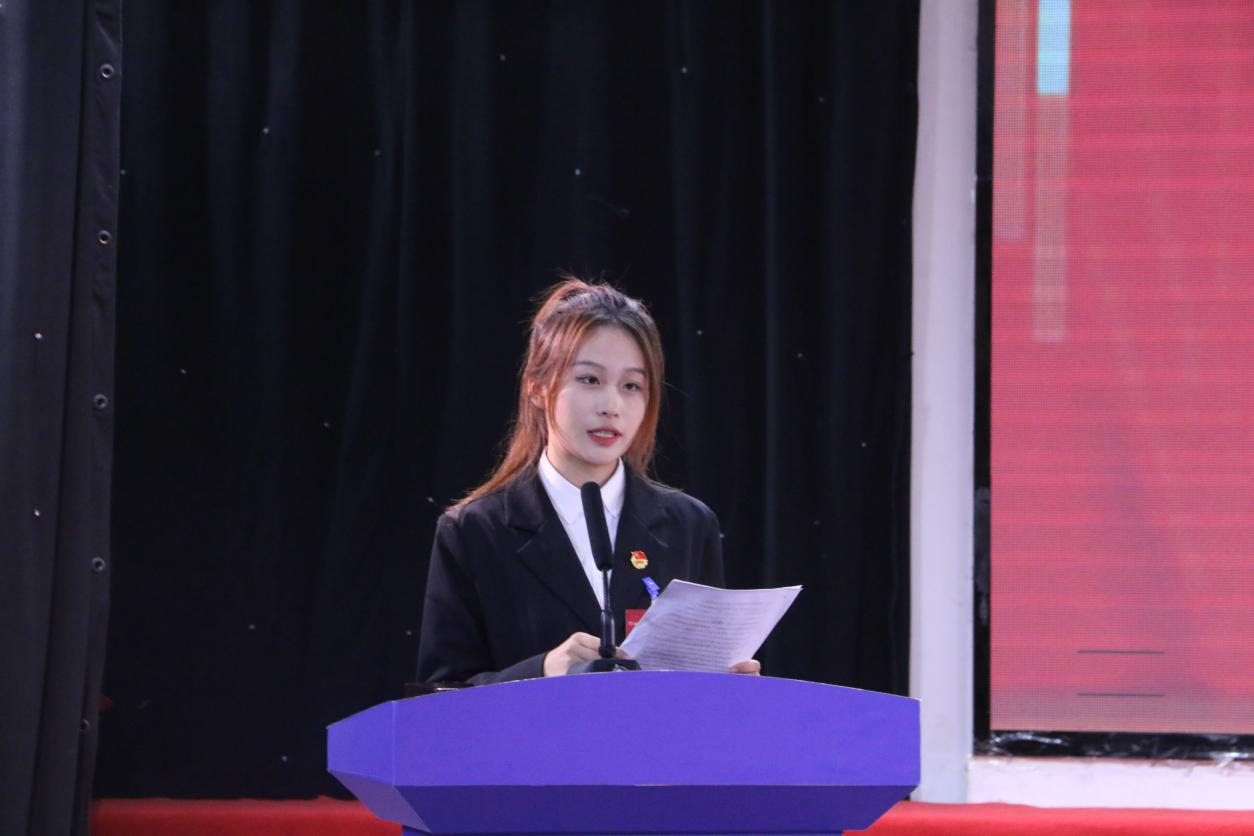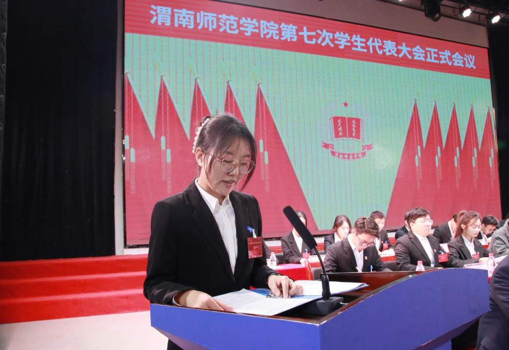 我校学生会主席团成员徐婷婷代表第六届学生委员会向大会作题为《不忘初心行志远,不负岁月勇作为,在建设特色鲜明的高水平地方特色师范大学征程中贡献青春力量》的工作报告。