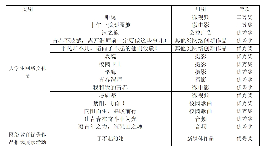 近日,由陕西省委教育工委、陕西省委网信办主办,陕西高校网络思政中心承办的第六届陕西高校大学生网络文化节和网络教育优秀作品推选展示活动入选结果揭晓,我校16项作品获奖,其中二等奖1项,三等奖1项,优秀奖14项。我校第二次参加此项活动以来,获奖等级和数量均有所提高,其中网络优秀作品推选展示活动和大学生网络文化节校园歌曲类、其他创新类作品均实现零的突破,1项作品还获评全国第六届大学生网络文化节其他创新类作品优秀奖。