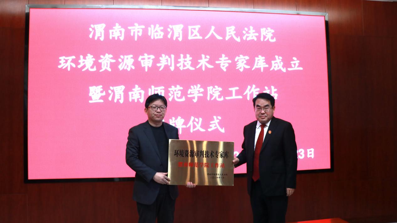在成立仪式上,渭南市中级人民法院副院长徐红卫为21名教师颁发了环境资源审判技术专家聘书,临渭区法院院长张东亮为渭南师范学院颁发“环境资源审判技术专家库渭南师范学院工作站”牌匾。会后,临渭区人民法院组织受聘专家等参观环境资源审判法庭。(通讯员 刘楠楠 审核人 吴逸群)