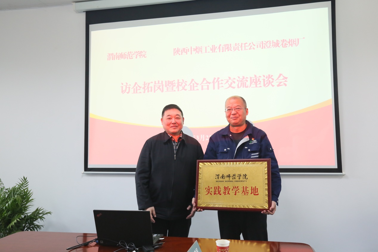 座谈会上,汪勇介绍了我校基本情况和此次访企拓岗的目的。卢爱刚强调,通过加强课题申报、开展培训、加强实践教学等活动,推进双方的融合发展。随后,卓宇授予陕西中烟澄城卷烟厂“渭南师范学院实践教学基地”牌匾。