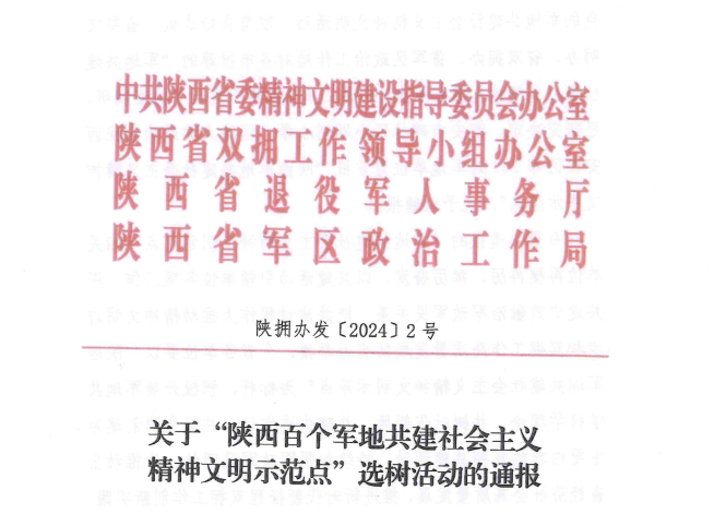 日前,省委文明办、省双拥办、省退役军人事务厅、省军区政治工作局4部门联合印发《关于“陕西百个军地共建社会主义精神文明示范点”选树活动的通报》。我校作为全省首批100对共建单位中唯一一所普通高等本科院校被授予“陕西军地共建社会主义精神文明示范点”荣誉称号。