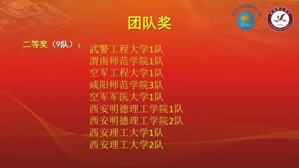 5月25日,由陕西省物理学会主办,咸阳师范学院物理与电子工程系承办的2024年陕西省大学生物理学术竞赛(线上)比赛开赛,我校物理与电气工程学院12名学生参加了此次竞赛,经过激烈角逐,最终从陕西省16所高校的33支参赛队伍中脱颖而出,分别获得个人一等奖九项,个人二等奖三项,同时还获得团体一等奖的好成绩,实现了我校自参加该赛事以来获奖的新的突破。