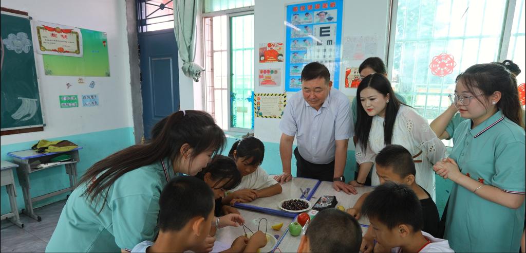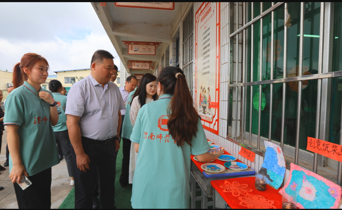 校领导一行实地查看并详细询问了实践团队活动开展情况,深入课堂观摩了支教队员给学生上课的情景。他们先后观摩了实践团成员精心设计的科学实验课堂,见证了知识的火花在孩子们眼中闪耀。在作品展示区,学生们亲手制作的黏土盘子色彩斑斓,创意纸浆画栩栩如生,还有精心培育的郁金香种子,每一份作品都承载着孩子们的成长与梦想,充分展现了支教活动结出的累累硕果以及孩子们的显著进步。