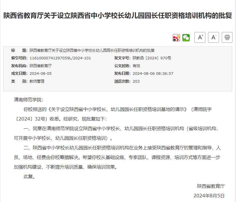 8月5日,省教育厅发布《陕西省教育厅关于设立陕西省中小学校长幼儿园园长任职资格培训机构的批复》【陕教函[2024]970号】,同意我校设立陕西省中小学校长幼儿园园长任职资格培训机构。