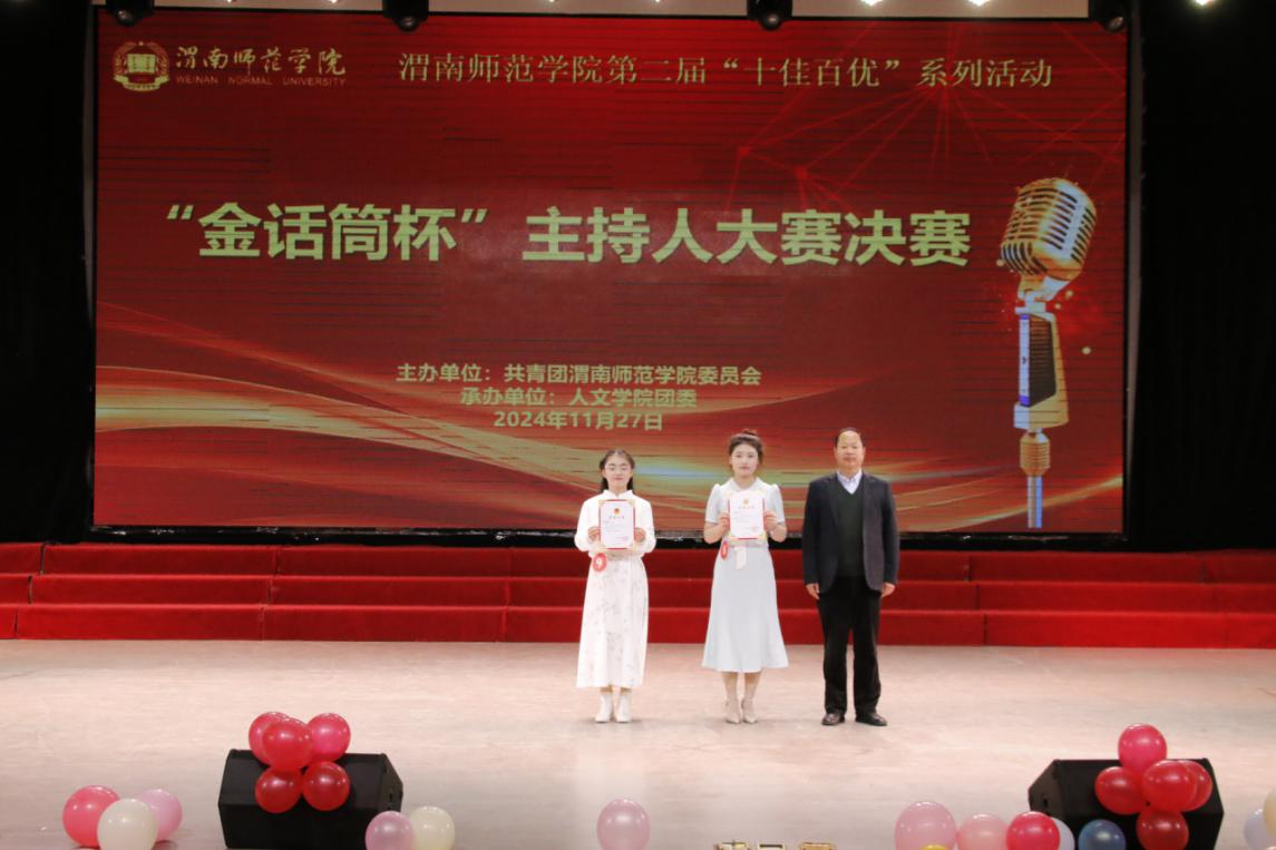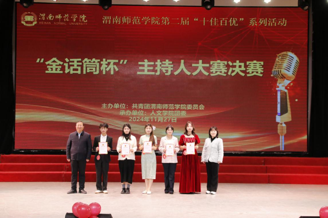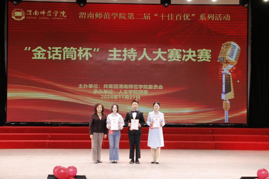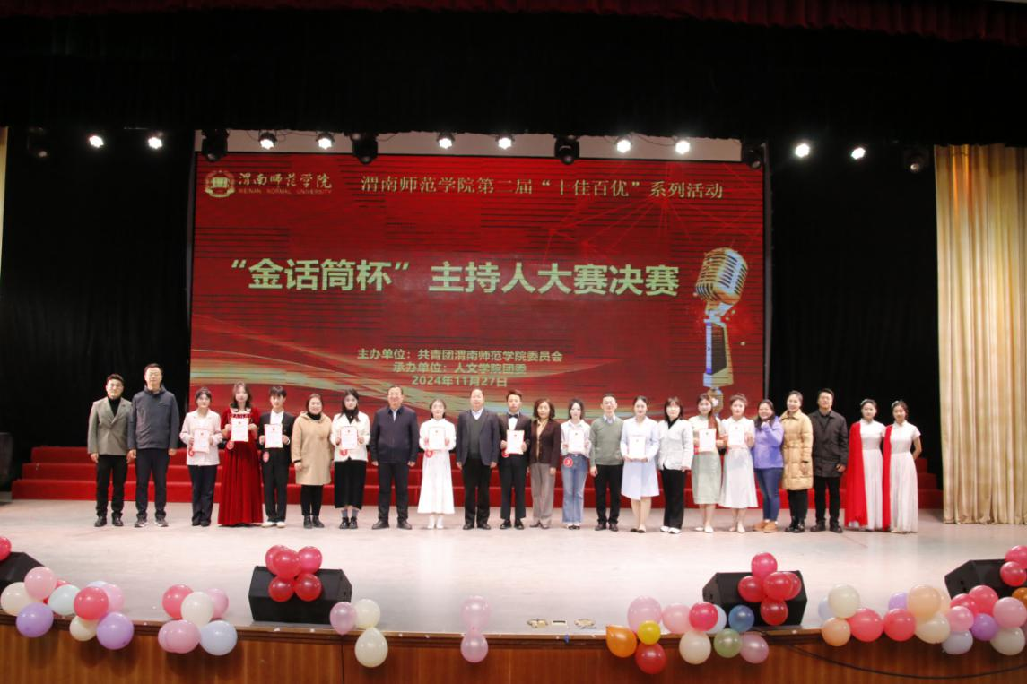 11月27日晚,由共青团渭南师范学院委员会主办,人文学院团委承办的我校第二届“十佳百优”系列活动—“金话筒杯”主持人大赛决赛在朝阳校区陶然楼演艺厅成功举办。学校党委副书记汪勇,副校长王菊霞出席活动。评委由渭南师范学院学报编审詹歆睿、党委宣传部副部长石明、人文学院新闻学专业教师马丹担任。