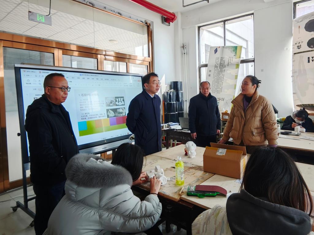 在调研过程中,张守华深入美术学院的《室内设计Ⅱ(商业空间)》和《篆刻临摹Ⅱ》课堂,观摩教学活动,并与教师及学生进行了深入的交流。他细致地了解教学过程中遇到的难点以及学生的反馈意见,并在此基础上提出了具有建设性的优化建议。他希望教师们树立大思政的课程理念,充分利用富平的红色资源,将理论与现实生活结合,引导学生从个体生活拓展到社会、国家层面的认知,帮助学生形成正确的价值观。他建议学生们围绕校长办公楼正在开展的“一站式”学生社区建设进行创新设计,打造多功能互动空间,促进师生交流,提升社区育人实效。学生们的作品要围绕教育家精神、富平地方文化等主题展开创作,并结合国际妇女节、母亲节等节日进行作品的设计。