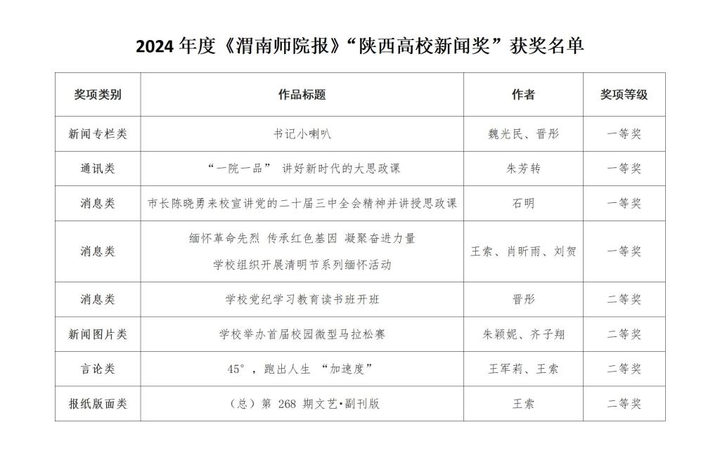 近日,陕西省高校校报研究会公布了2024年度“陕西高校新闻奖”评选结果,我校《渭南师院报》选送的8件作品获奖,其中一等奖4件,二等奖4件,获奖类别实现了全覆盖。