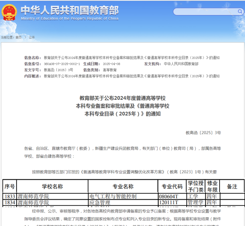 日前,教育部公布了2024年度普通高等学校本科专业备案和审批结果。我校申报的“电气工程与智能控制”“应急管理”两个本科专业获得教育部批准备案。